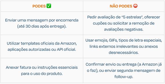 - 1 encomenda = 1 pedido de avaliação (via Buyer-Seller Messaging ou botão Request a Review).